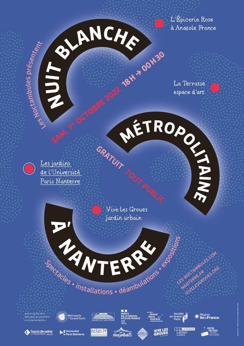 Au croisement des chemins et des genres, une soirée pleine de surprises imaginées par. Les Noctambules et leurs complices la Terrasse espace d’art, Vive les Groues, l’Épicerie Rose Anatole France, le festival Parade(s) et l’Université Paris Nanterre. Une soirée de rêveries poétiques, végétales et musicales, d’arts visuels, d’acrobaties aériennes et polymorphes, de gourmandises et autres surprises.